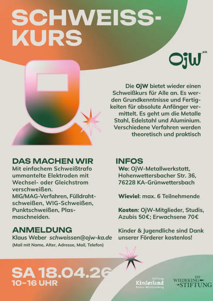 Die OjW bietet wieder einen Schweißkurs für Alle an. Es werden Grundkenntnisse und Fertigkeiten für absolute Anfänger vermittelt. Es geht um die Metalle Stahl, Edelstahl und Aluminium. Verschiedene Verfahren werden theoretisch und praktisch vorgestellt und selbst erprobt.