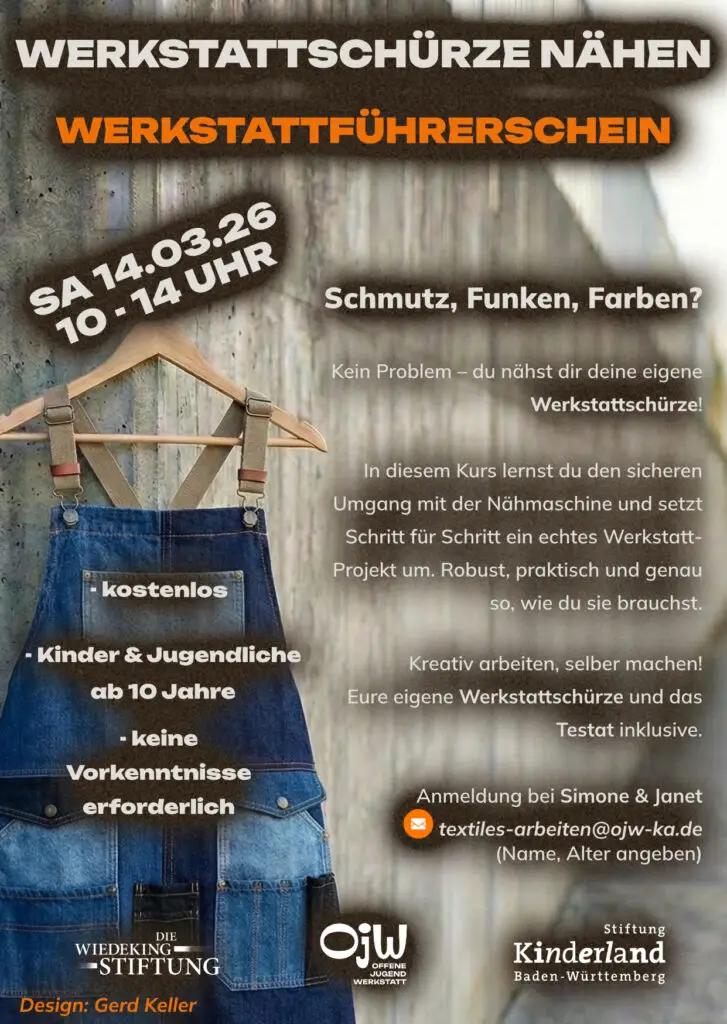 Schmutz, Funken, Farben? Kein Problem – du nähst dir deine eigene Werkstattschürze! In diesem Kurs lernst du den sicheren Umgang
