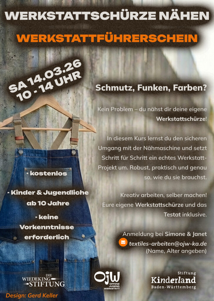 Schmutz, Funken, Farben? Kein Problem – du nähst dir deine eigene Werkstattschürze! In diesem Kurs lernst du den sicheren Umgang