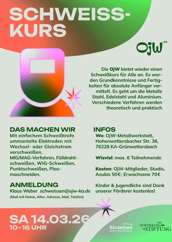 Die OjW bietet wieder einen Schweißkurs für Alle an. Es werden Grundkenntnisse und Fertigkeiten für absolute Anfänger vermittelt. Es geht